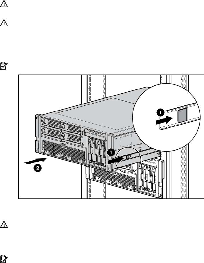 rail-release latches and sliding the server into the rack. The sliding rails could pinch your