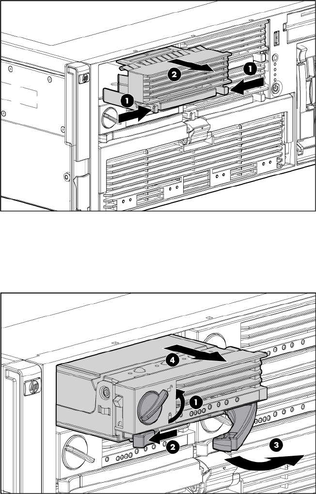 To remove the memory board blank, squeeze the levers and pull the blank out of the server.