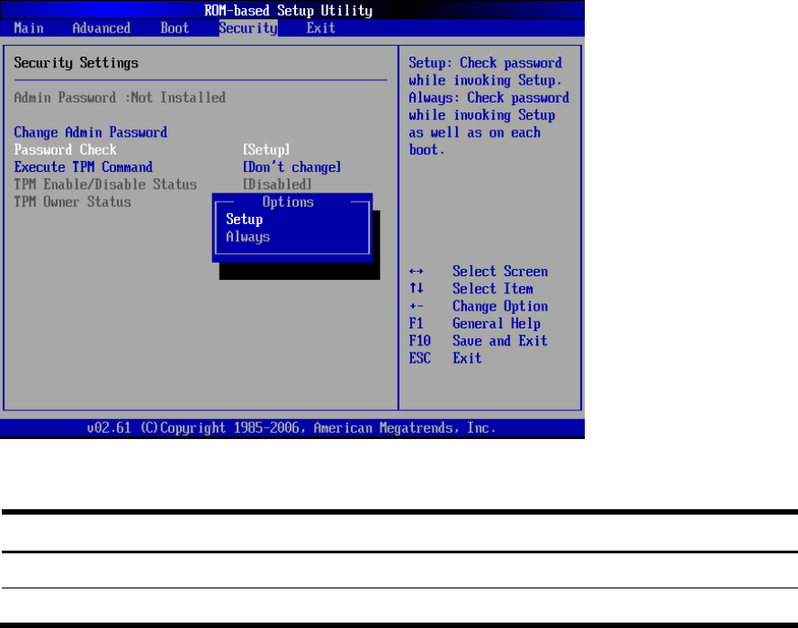 1. In the Security menu screen, select Password Check, and then press Enter.