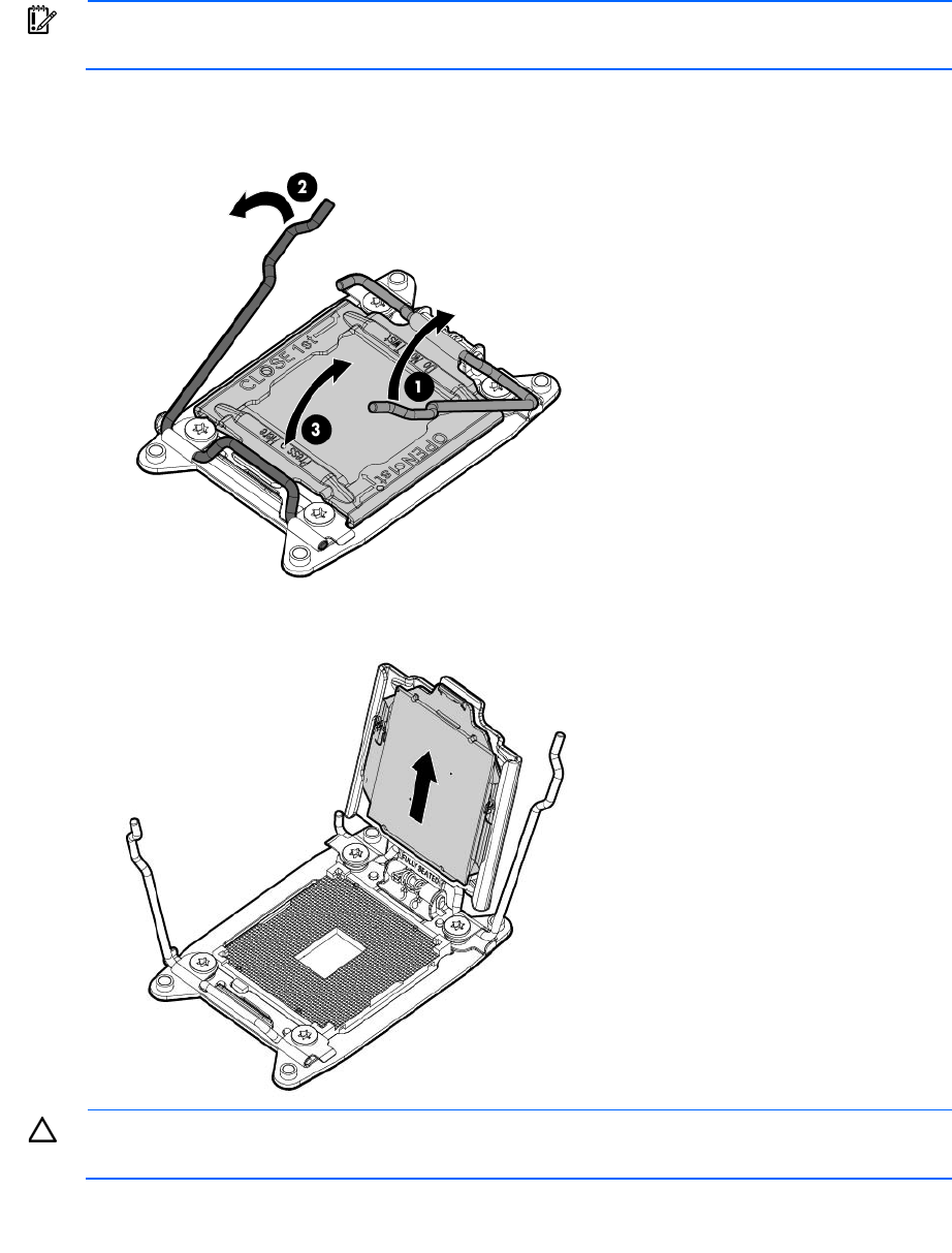 6. Open each of the processor locking levers in the order indicated, and then open the processor retaining