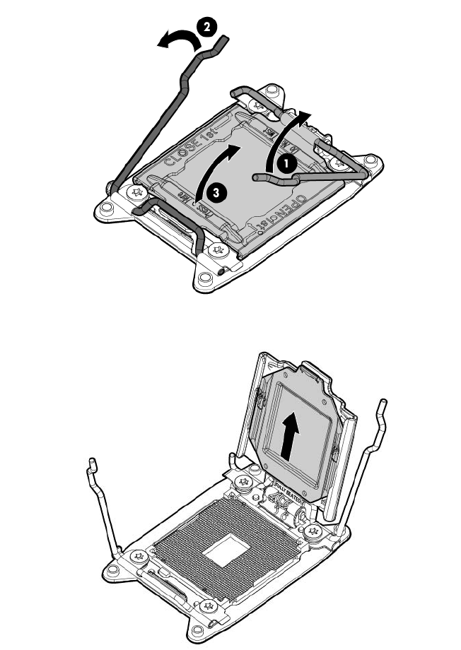 Open each of the processor locking levers in the order indicated, and then open the processor retaining
