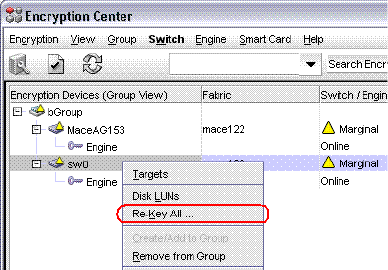 2. Select the switch on which to perform a manual re-key from the Encryption Center Devices