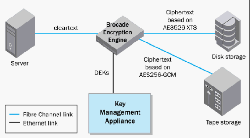 Figure 2 provides a high-level view of the Brocade encryption solution. Cleartext is sent from the