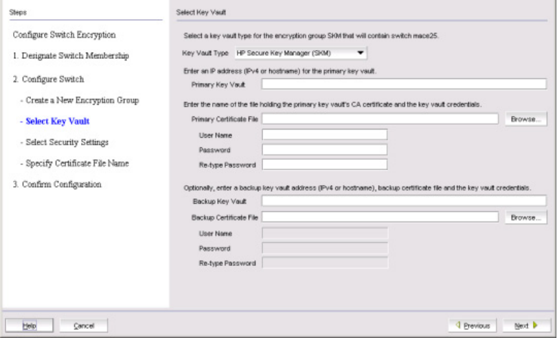 6. If you are using a backup key vault, enter the IP address or host name, and the name of the file
