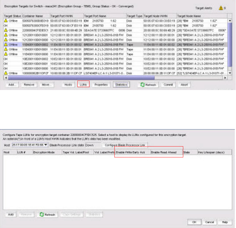 FIGURE 54 Encryption Target Tape LUNs dialog box - Setting tape LUN read ahead and write early