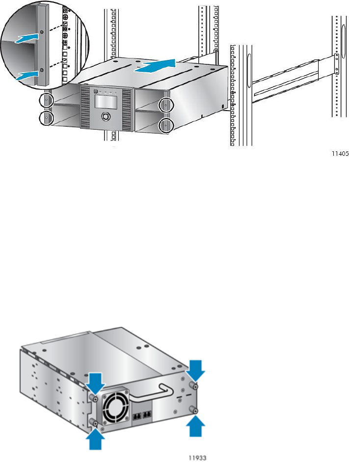 2. Loosen the blue captive thumbscrews on the tape drive as shown in Figure 17, page 35.