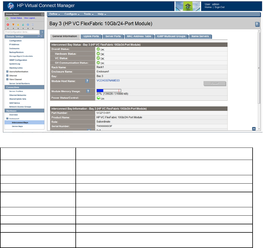 This screen provides a summary of the interconnect module status and general information. To remove a
