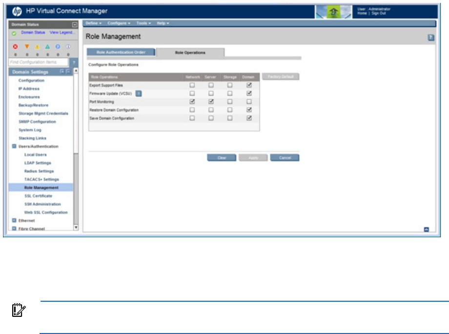 Use this screen to change the role operations allowed for Network, Server, Storage, and Domain roles. You