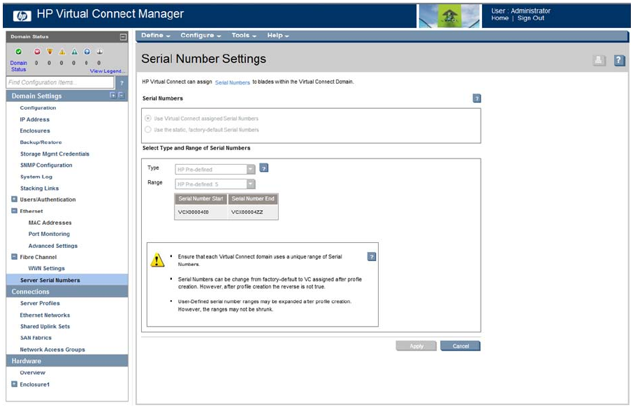 Serial numbers for the domain are provided by Virtual Connect. You can override this setting and use the