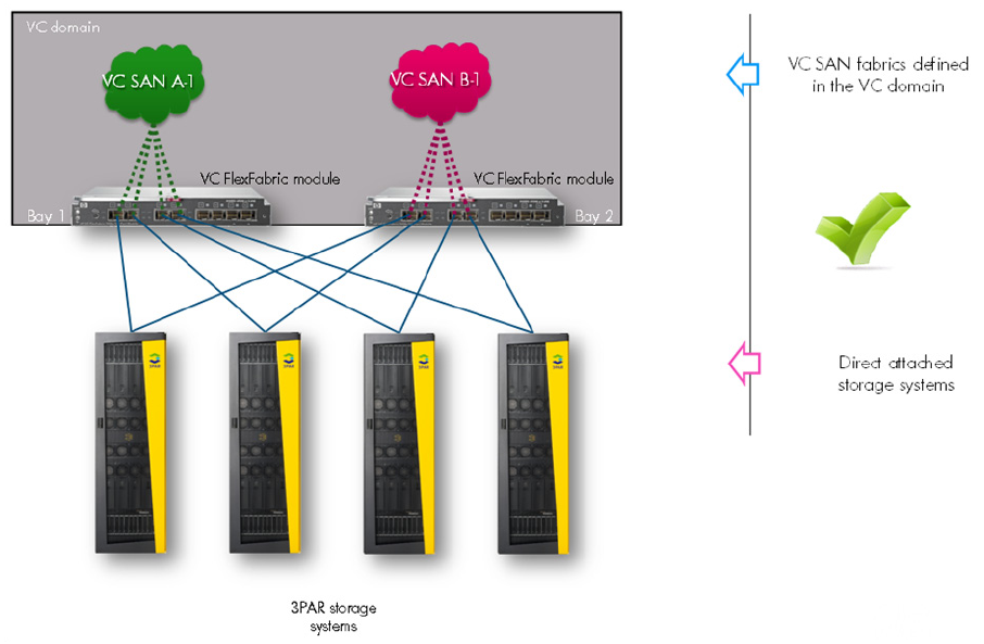 • You can attach up to four HP 3PAR storage systems directly to the VC FlexFabric module using a single