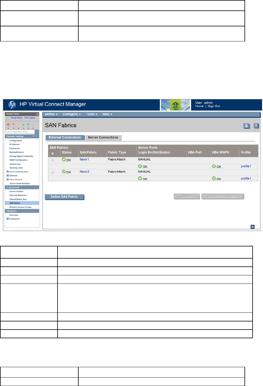 This screen lists all of the SAN fabrics that have been created and displays the server connection information.