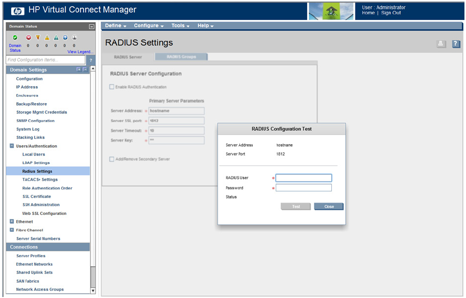 Users with domain user role permissions can test their RADIUS configuration before making the configuration
