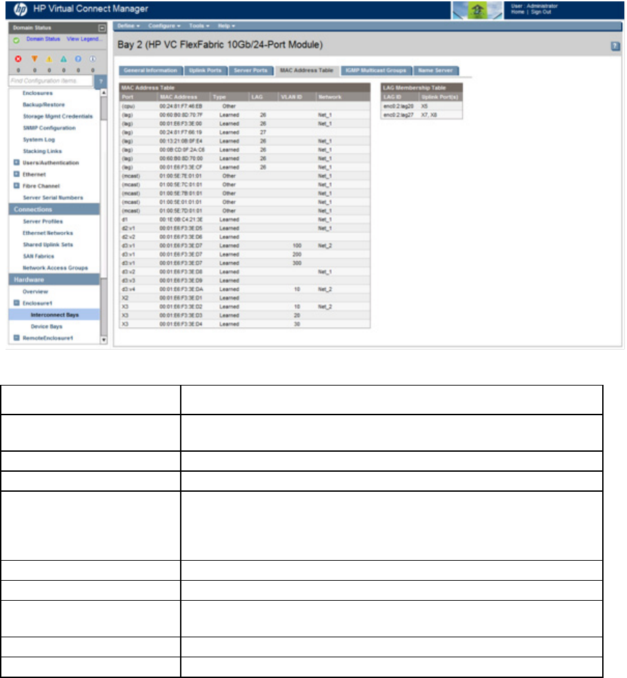 This screen shows the MAC addresses that have been seen on the ports of the VC-Enet module. If a network