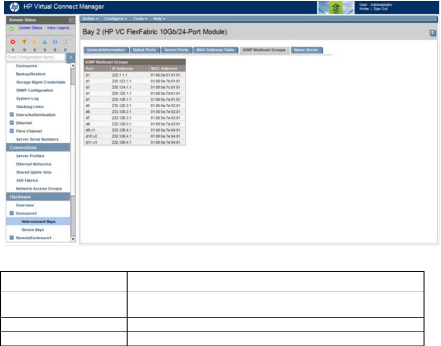This screen shows the IGMP multicast groups that are active on ports of this VC-Enet module. The multicast