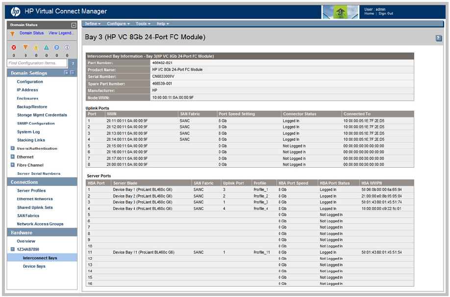 To see how logins are currently distributed on the VC-FC module, navigate to the Interconnect Bays Status