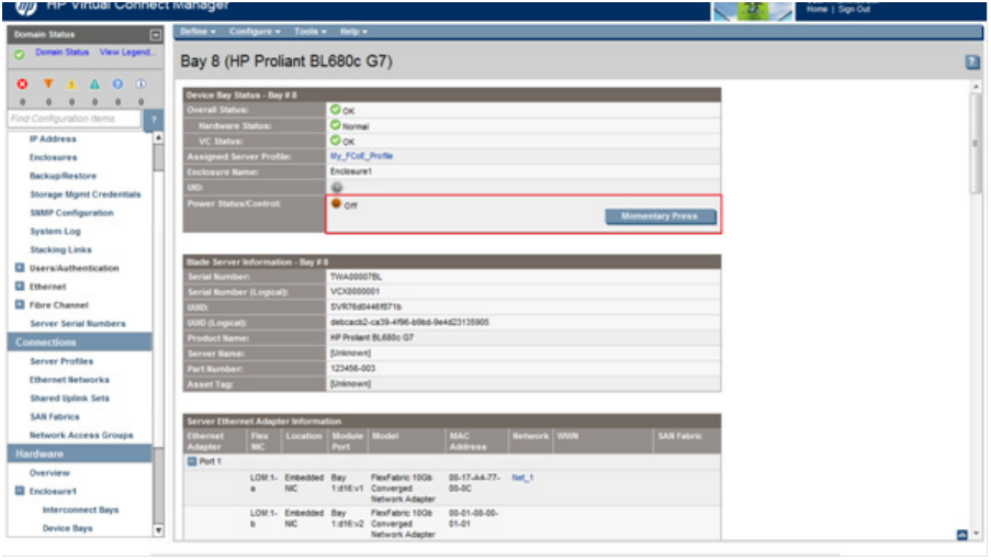 - Assigning a server profile with FCoE connections to an HP ProLiant BL680c G7 Server Blade