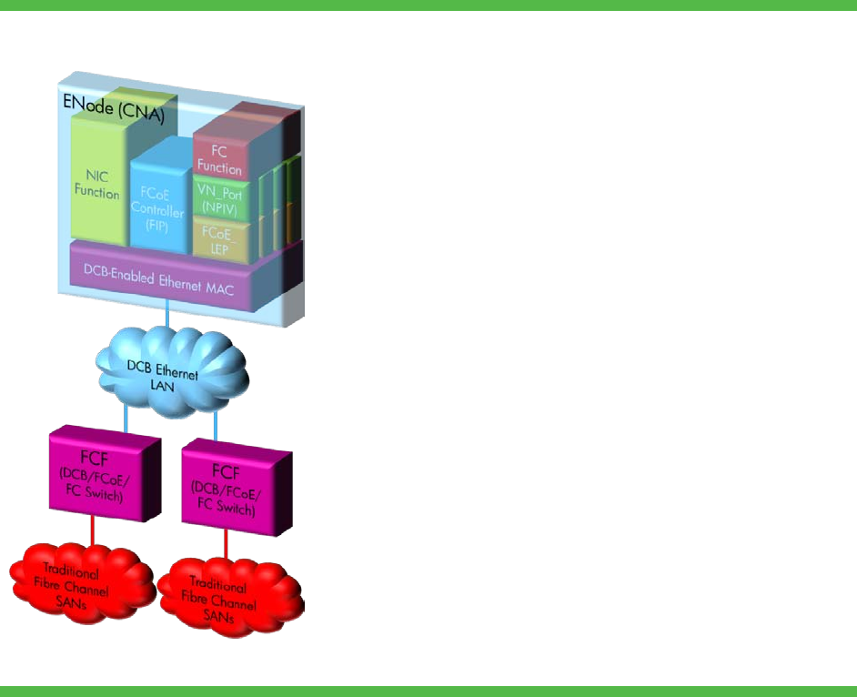 • FCoE Controller uses FCoE Initialization Protocol (FIP) to discover the SAN fabrics through the FCFs and