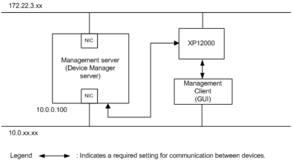 • XP12000/XP10000/SVS200 and the management server (the server computer whose IP address