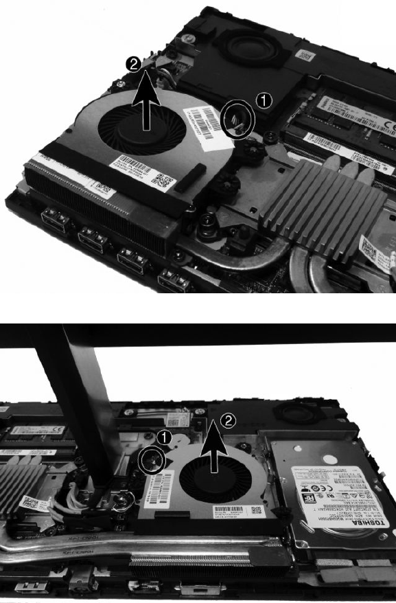 3. Disconnect the fan cable from the system board (1), and then pull the fan straight up and o the posts