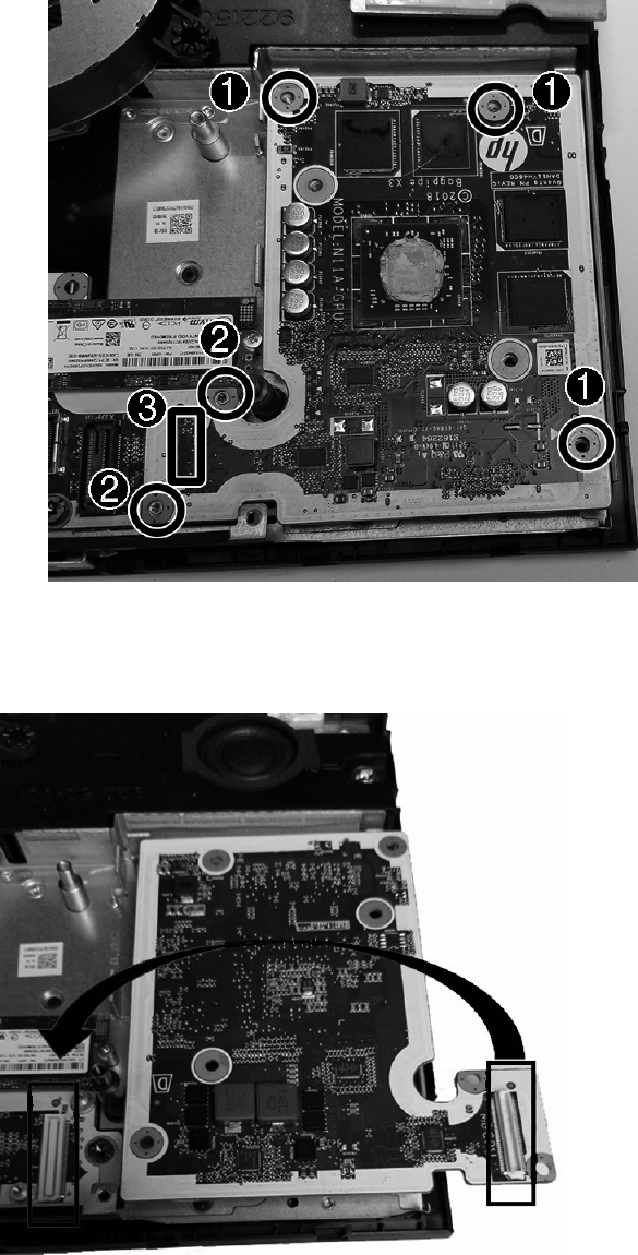6. Lift the left side of the graphics card to disengage the connector underneath from the system board (3),