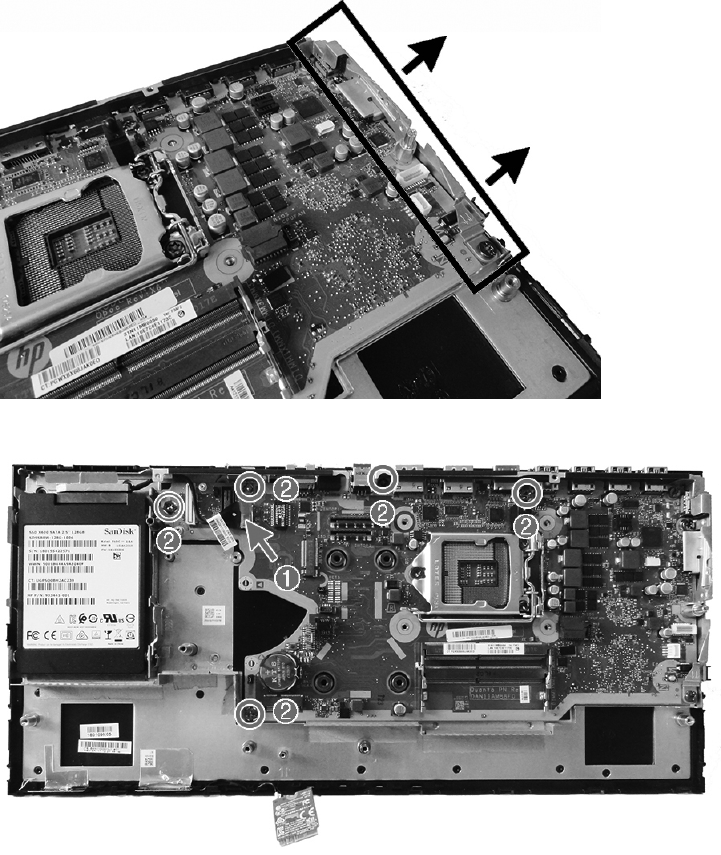 13. Remove the ve Torx screws (2) that secure the system board to the computer.