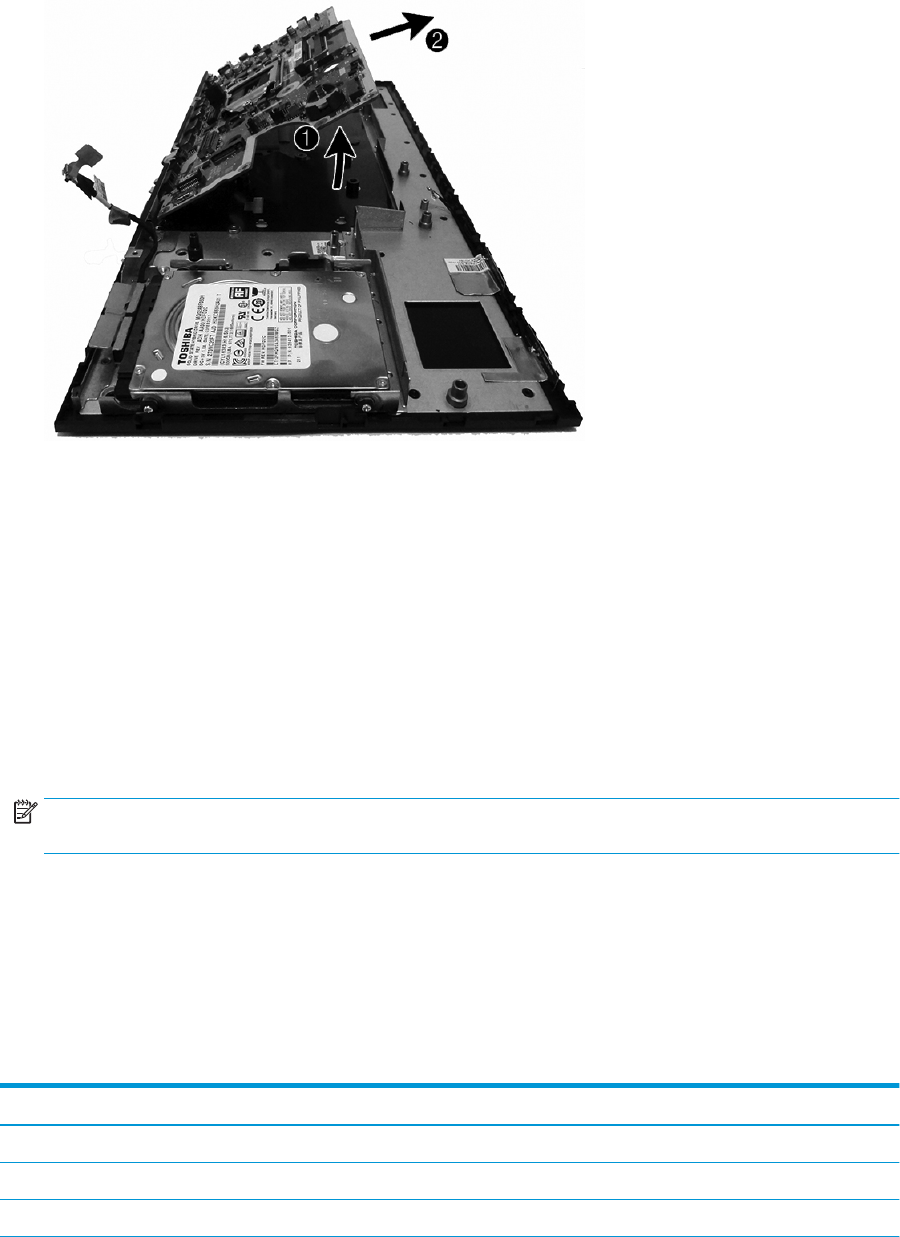 14. Rotate the side of the system board upward (1), and the pull it away from the I/O connectors and out of