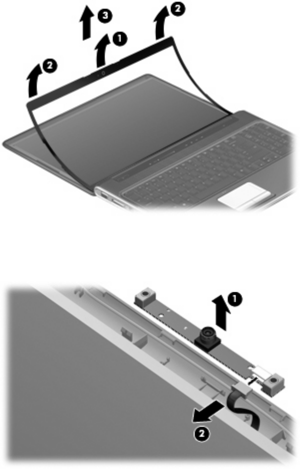 6. Disconnect the webcam/microphone module cable (2) from the webcam/microphone module.