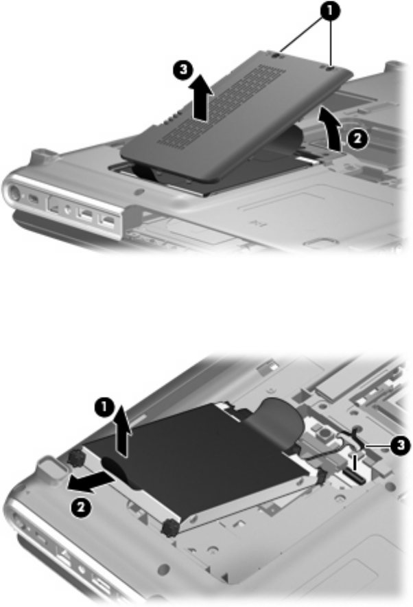3. Lift the right side (2) of the hard drive cover, swing it up and to the left, and remove the cover (3).
