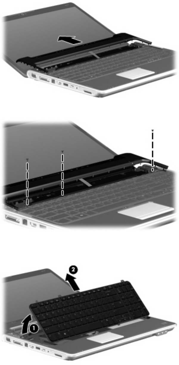 9. Slide the keyboard (2) back until the keyboard connector on the system board is accessible.