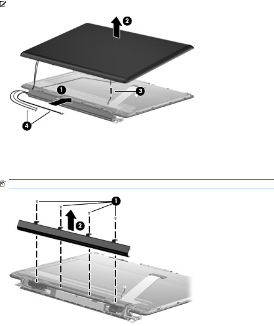 10. Remove the WLAN antenna cables and the webcam cable (4) from the left hinge.