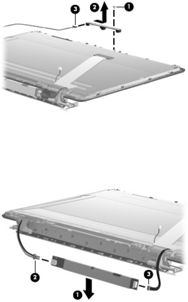 19. Disconnect the backlight cable (2) and display panel cable (3) from the display inverter.