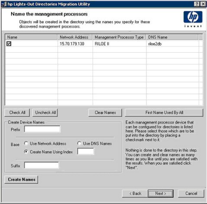 Select Use Network Address, Use DNS Names, or Create Name Using Index. You can