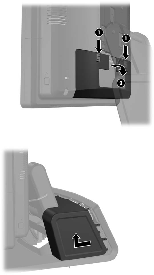3. Slide down the two levers on the upper corners of the rear I/O panel (1) and rotate the cover off