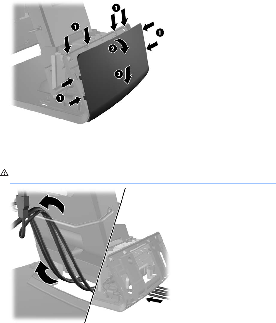 6. Route the cables underneath the rear of the base, then through the hole in the center of the