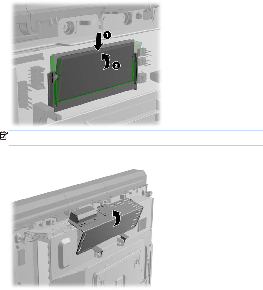 then press the SODIMM down into the socket (2) so that the latches lock it in place.