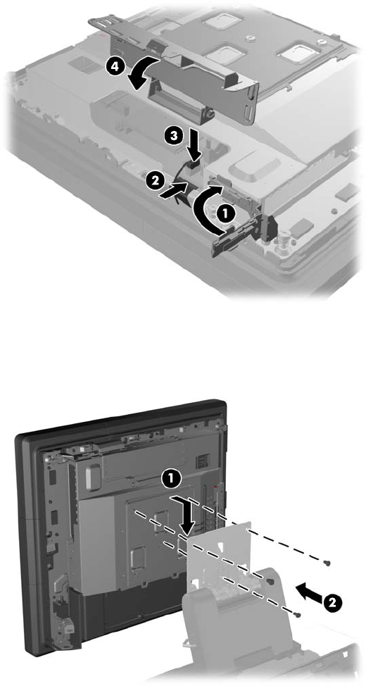 14. Swing the antenna bracket in toward the chassis (1), connect the DisplayPort signal cable (2)