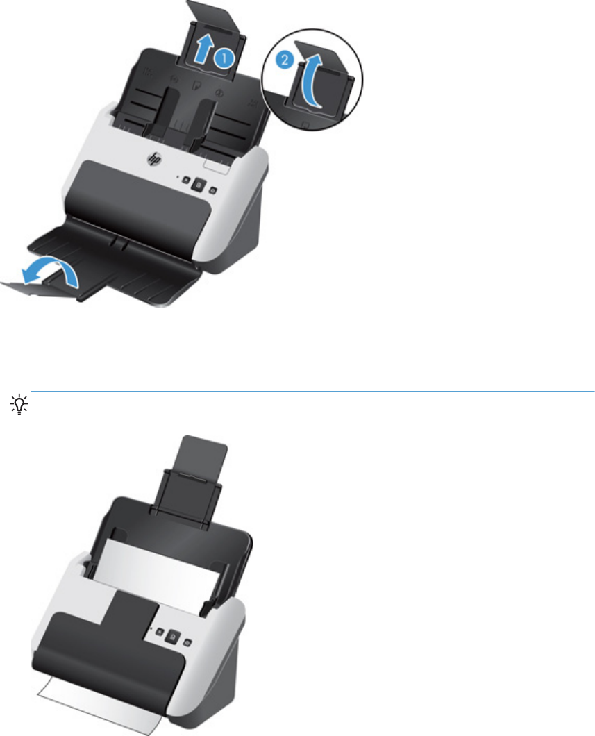 b. Open the document output tray, and then flip up the hinged extension flap.