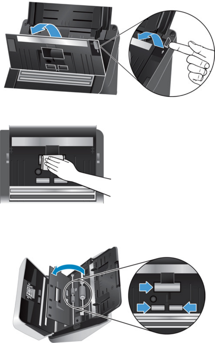 a. Wipe the three feed rollers on the rear of the open hatch which were made accessible when