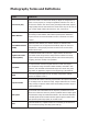 Photography Terms and Definitions Terms Definitions Auto Focus (AF) Auto focus refers to a camera lens’ ability to adjust its configuration in order to focus properly on a subject regardless of whether it is near or far from the camera. Auto focus lenses generally provide vastly superior image quality than do their fixed focus cousins since they do not have to rely on their depth of field. Also known as: “AF”, “auto-focus”.