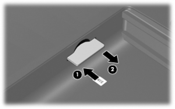 7. Press in on the SIM (1), and then remove it from the slot (2).