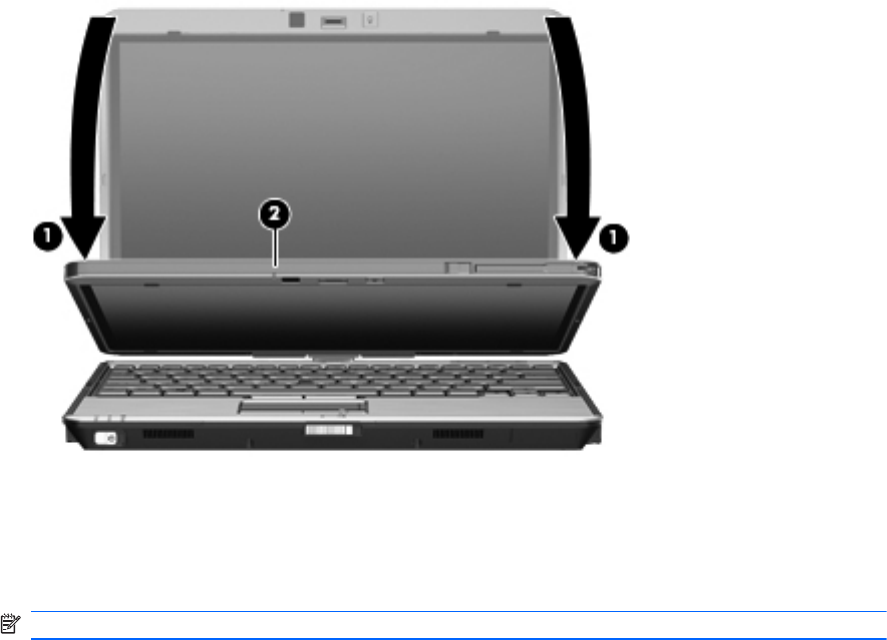 4. 慢慢放低显示屏 (1),直至网络摄像头指示灯 (2) 停止闪烁并听到声音。