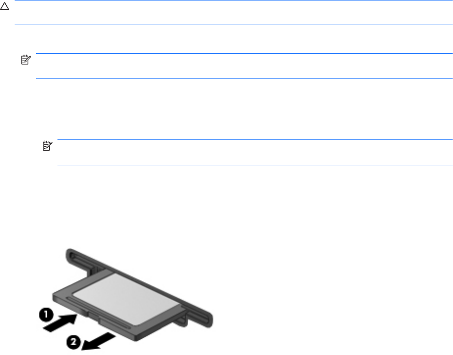 3. メディア カードを押して固定を解除し(1)、カードを引いてスロットから取り出します(2)。