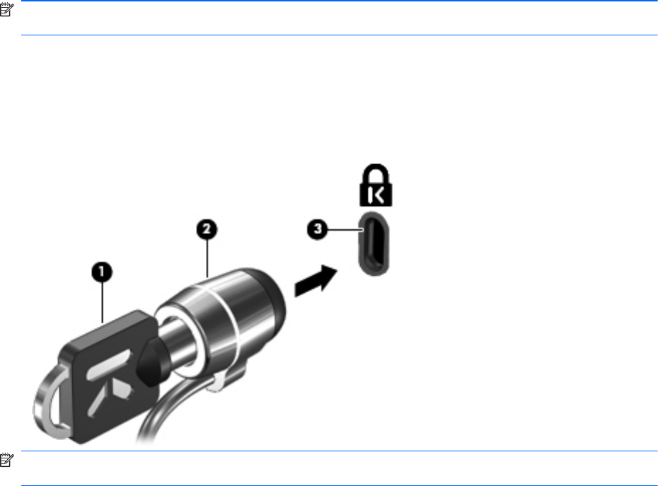 (3)に差し込み、鍵を回転させてセキュリティ ロック ケーブルを固定します。
