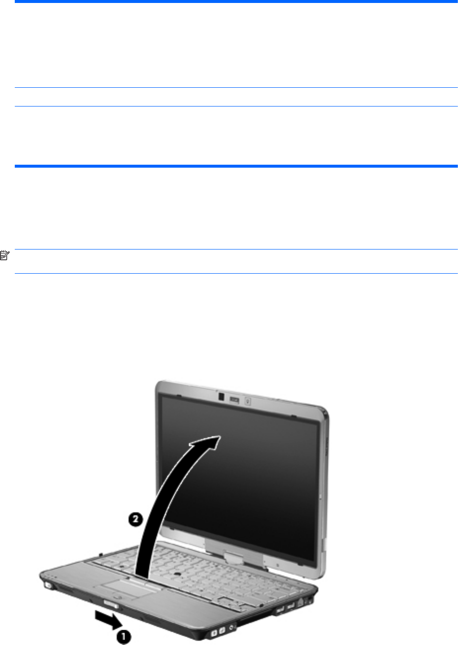 1. ディスプレイ リリース ラッチをスライドさせてディスプレイをリリースし(1)、コンピュー