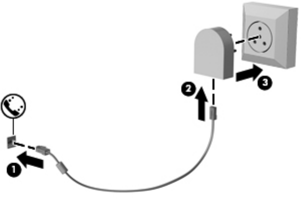 3. 各国仕様のモデム ケーブル アダプターを電話回線用モジュラー コンセントに接続します(3)。