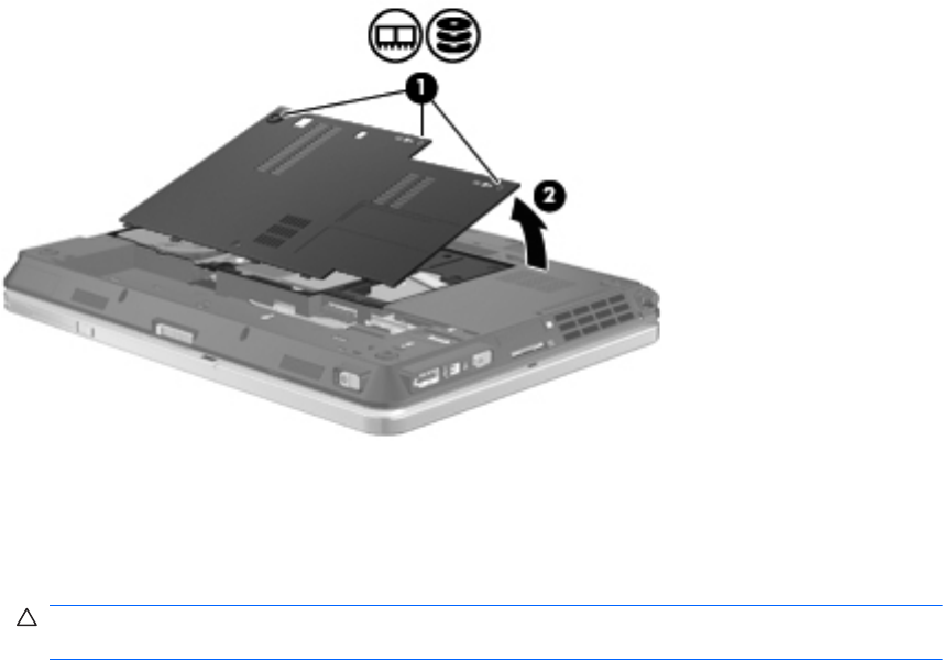 8. Levante a tampa do compartimento da unidade de disco rígido, retirando-a do computador (2).