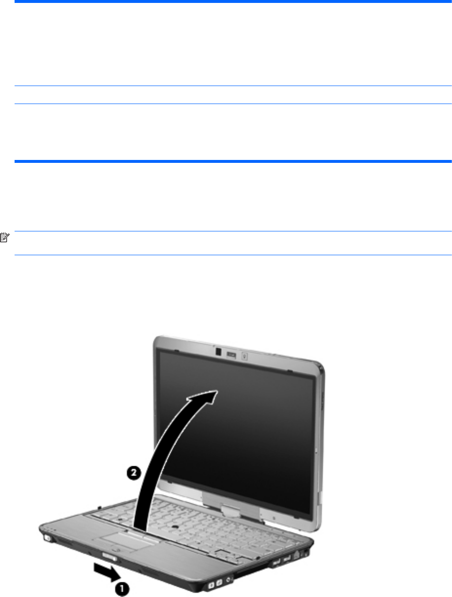 1. Deslize a trava de liberação da tela para liberar a tela (1) e então abra a tela do computador (2).