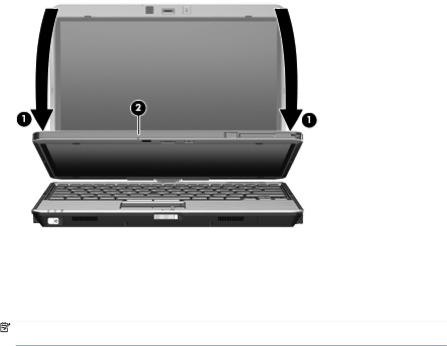 4. Senken Sie langsam das Display (1), bis die Webcam-LED (2) nicht mehr blinkt und ein