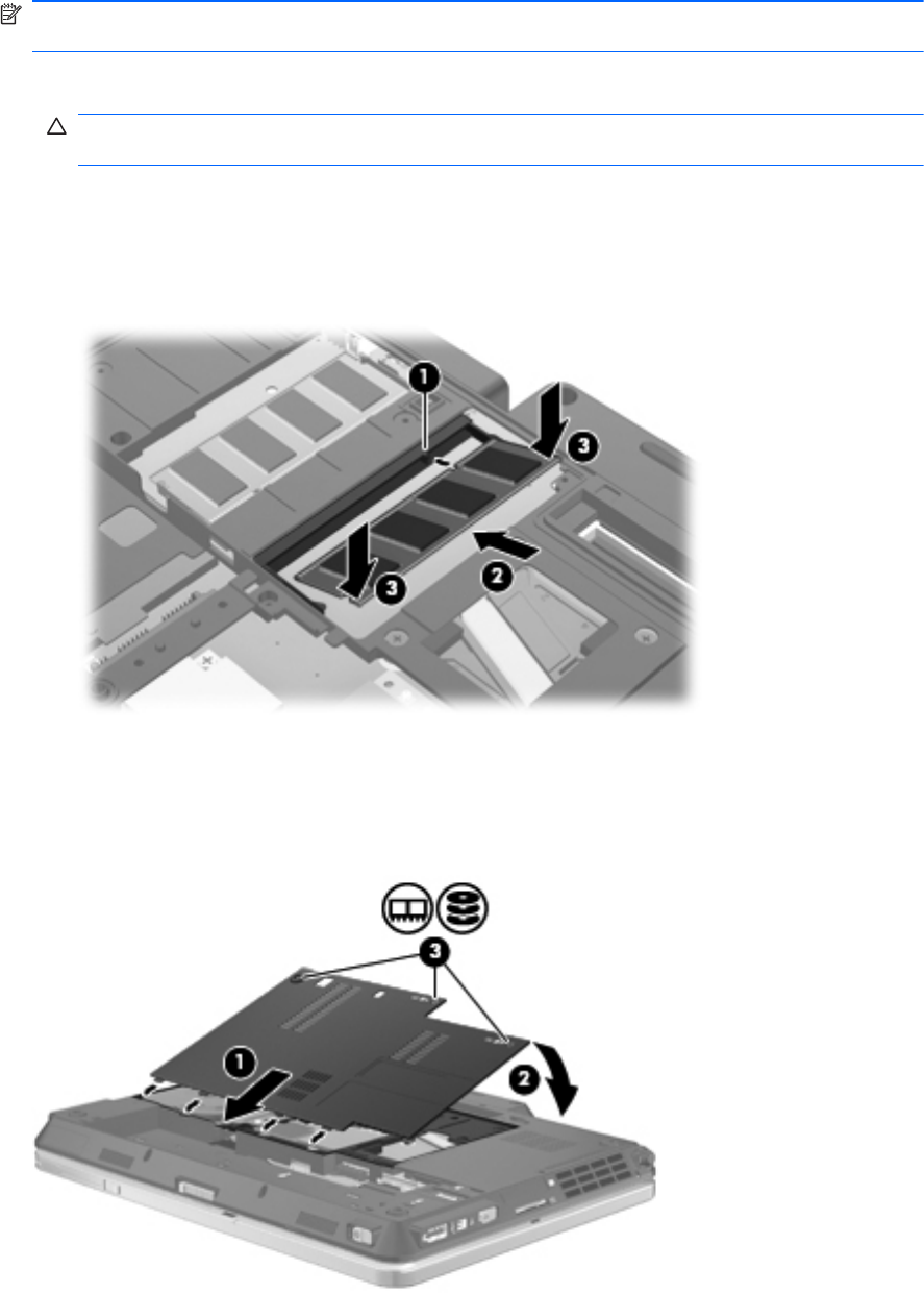 c. Delikatnie dociśnij moduł pamięci (3), dociskając jednocześnie jego lewy i prawy brzeg, aż