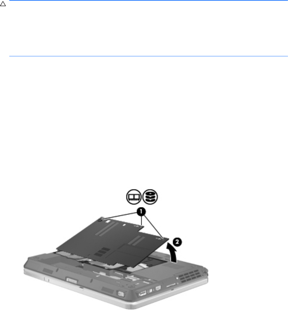 9. Remova os dois parafusos da tampa da baía de disco rígido (1).